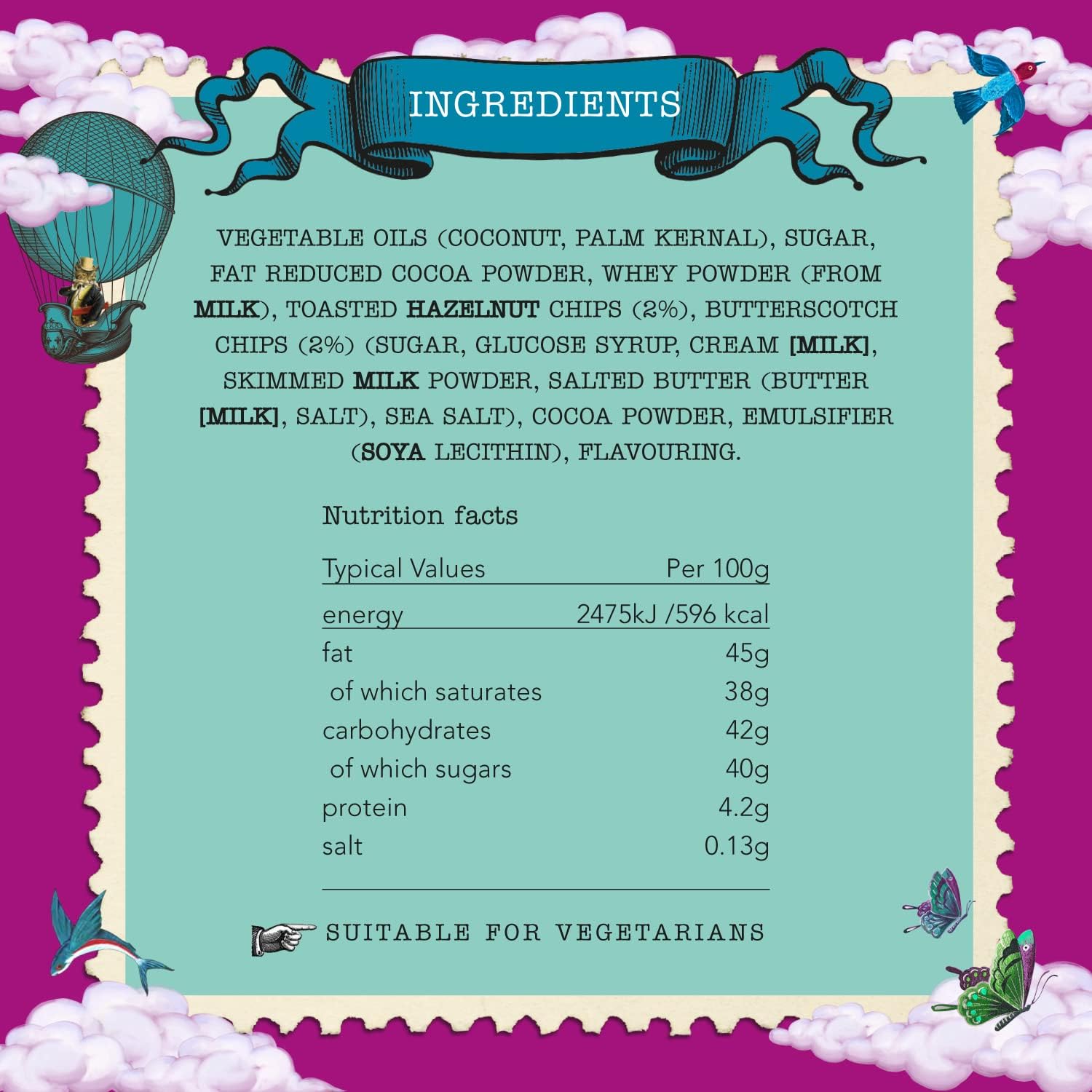 Ingredients: Vegetable Oils (Coconut, Palm Kernel), Sugar, Fat Reduced Cocoa Powder, Whey Powder (from MILK), Toasted HAZELNUT Chips (2%), Butterscotch Chips (2%) (Sugar, Glucose Syrup, Cream [MILK], Skimmed MILK Powder, Salted Butter(Butter[MILK], Salt), Sea Salt), Cocoa Powder, Emulsifier (SOYA Lecithin), Flavouring. AllergyAdvice: For Allergens, see ingredients in BOLD. It may contain traces of BARLEY, EGGS, Other NUTS, SESAME&WHEAT. Suitable for Vegetarians.